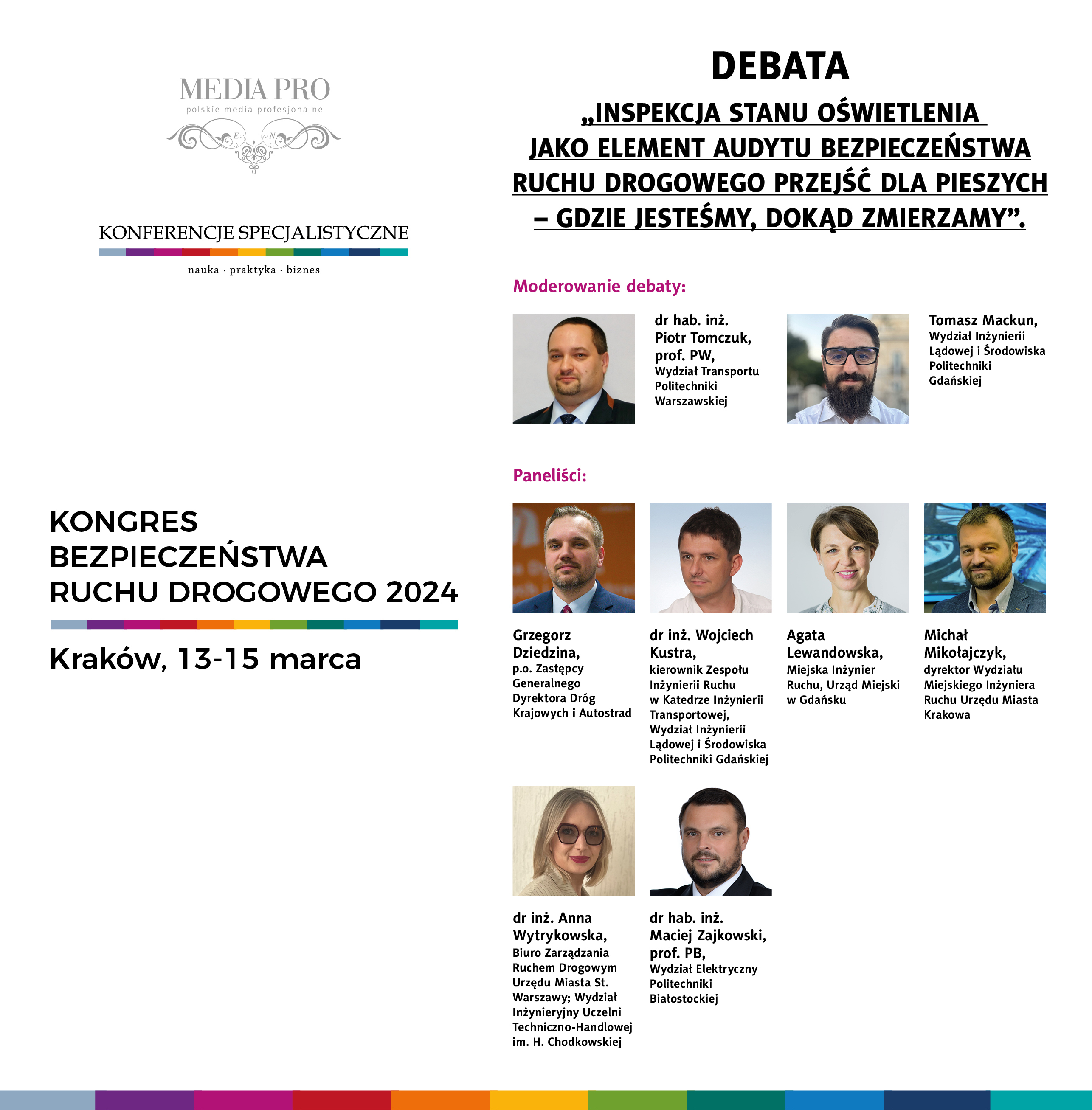 Wnioski z V Ogólnopolskiego Forum Specjalistycznego „Oświetlenie ulic i dróg - OŚWIETLENIE 2024”. Opracował zespół pod kierunkiem dr. hab. inż. Piotra Tomczuka, profesora uczelni, Zakład Systemów Informatycznych i Mechatronicznych w Transporcie, Wydział Transportu Politechniki Warszawskiej, przewodniczącego Rady Programowej V Ogólnopolskiego Forum Specjalistycznego „Oświetlenie ulic i dróg - OŚWIETLENIE 2024” w ramach konferencji KONGRES BEZPIECZEŃSTWA RUCHU DROGOWEGO 2024 Kraków, 13-15.03.2024 r. W Forum wzięli udział przedstawiciele władz, zarządcy infrastruktury, firmy wykonawcze, producenci opraw, osoby kontrolujące, produkujące osprzęt pomiarowy, osoby zainteresowane bezpieczeństwem ruchu drogowego, naukowcy, specjaliści z różnych dziedzin nauki oraz przedstawiciele mediów. Zainteresowanie tematyką oświetlenia infrastruktury drogowej i przestrzeni publicznej świadczy o stałej poprawie kultury oświetleniowej i rosnącej świadomości potrzebnych zmian i uzyskiwanych efektów, co niewątpliwie przyczynia się do poprawy brd. Działania podjęte na Forum Oświetlenie 2024 pozwalają promować wysoką jakość stosowanych rozwiązań technicznych i wymieniać doświadczenia w zakresie ich wdrażania. Wskazane jest wzmocnienie kierowania przekazu do wszystkich jednostek samorządowych (gmin i powiatów). Działania na najniższym szczeblu samorządowym wymagają szczególnego wsparcia w zakresie kompetencji i wiedzy merytorycznej. Na konferencji zostało poruszonych wiele interesujących tematów z zakresu projektowania oraz eksploatacji urządzeń oświetleniowych ze szczególnym uwzględnieniem aspektów pomiarowych w zakresie kontroli poziomów natężenia oświetlenia, luminacji nawierzchni oraz kontrastu luminancji niechronionych uczestników ruchu drogowego z otaczającym tłem obserwacji. Poruszono aktualną tematykę zaśmiecania światłem w aspekcie badawczym (pomiary) oraz doboru środków zaradczych, aby zmniejszyć to niekorzystne oddziaływanie na organizmy żywe. Powiązano też zagadnienia oświetleniowe oraz wykazano ich wpływ na poziom brd. Szczególną uwagę poświecono bezpieczeństwu pieszych w obrębie przejść dla pieszych oraz w miejscach szczególnych, gdzie krzyżują się potoki ruchu różnego rodzaju (np. pętle tramwajowe i autobusowe). To bezpieczeństwo w dużej mierze jest kreowane poprzez skuteczne i dobrze zaprojektowane oświetlenie, które jest utrzymywane w dobrym stanie technicznym, a weryfikowane poprzez prawidłowo przeprowadzone pomiary. Podczas debaty i wystąpień prelegentów często poruszaną kwestią było właściwe utrzymanie infrastruktury oświetleniowej poprzez wykonywanie regularnych inspekcji oświetlenia i realizowanie zaleceń pokontrolnych. Kwestia występowania audytu oświetleniowego jako integralnej i wymaganej części audytu elektrycznego nie budziła żadnej wątpliwości wśród ekspertów. Ten element w postaci rzetelnych i powtarzalnych pomiarów oświetleniowych realizowanych w zaplanowanych cyklach czasowych oraz etapach życia instalacji jest bardzo istotny. Ważną kwestią są procedury badawcze i pomiarowe. Taka procedura powinna być opracowana przez badaczy (naukowców), a następnie zweryfikowana przez środowisko związane z oświetleniem. Powinny zostać zdefiniowane wielkości oświetleniowe podlegające kontroli oraz wartości graniczne, sposób przeprowadzenia pomiarów, warunki w jakich pomiar jest możliwy, sposób prezentacji wyników i zaleceń, sposób dokumentowania oraz zestawiania wyników. To wszystko składa się na kompletną metodykę pomiaru, która gwarantuje rzetelne zweryfikowanie stanu faktycznego oraz powtarzalność pomiarów niezależnie od zespołu badawczego, który ten pomiar realizuje oraz czasu w jakim jest wykonany. Bez jednolitej procedury trudno o porównanie wyników modernizacji oświetlenia w momencie, gdy w przeszłości zespół pomiarowy stosował inne kryteria oceny. Podczas dyskusji dużo czasu poświęcono właściwej edukacji oraz tworzeniu „kultury oświetleniowej”. Większa świadomość w tym względzie zarówno ludzi z branży oświetleniowej jak i uczestników ruchu drogowego pomaga we właściwym oświetlaniu powierzchni, a nie świeceniu z niekontrolowanym rozsyłem światła. Uświadomienie uczestnikom ruchu drogowego procesów fizjologicznych związanych z widzeniem, pozwala na zwiększenie poziomu bezpieczeństwa i zwraca uwagę na wiele aspektów np. że łatwiej dostrzec światła samochodu z perspektywy pieszego niż pieszego z perspektywy kierowcy. Pytanie kto ma weryfikować czy instalacja oświetleniowa jest prawidłowo wykonana i eksploatowana? Tu pojawiły się propozycje uprawnień i świadectw kwalifikacji dla wyspecjalizowanej kadry oświetleniowej. Skoro audytor brd musi mieć uprawnienia potwierdzające jego umiejętności i wiedzę, to audytor oświetleniowy też powinien mieć analogiczny dokument, który wiąże się ze zdaniem stosownych egzaminów. Zapisy w świadectwach kwalifikacji wydawanych przez np. Stowarzyszenie Elektryków Polskich odnoszą się do parametrów elektrycznych instalacji, a nie do zagadnień oświetleniowych. Zwrócono uwagę na dużą rolę projektantów oświetlenia w doborze właściwych rozwiązań oświetleniowych. Wszystko zaczyna się od dobrego projektu, potem trzeba go dobrze wykonać, a na koniec zmierzyć i potwierdzić parametry oświetleniowe, czy są zgodne z założeniami projektanta. Na każdym etapie można popełnić błąd, który najłatwiej wychwycić poprzez wstępny audyt projektu, a po wykonaniu instalacji poprzez pomiar zgodnie z przyjętą jednolitą procedurą.