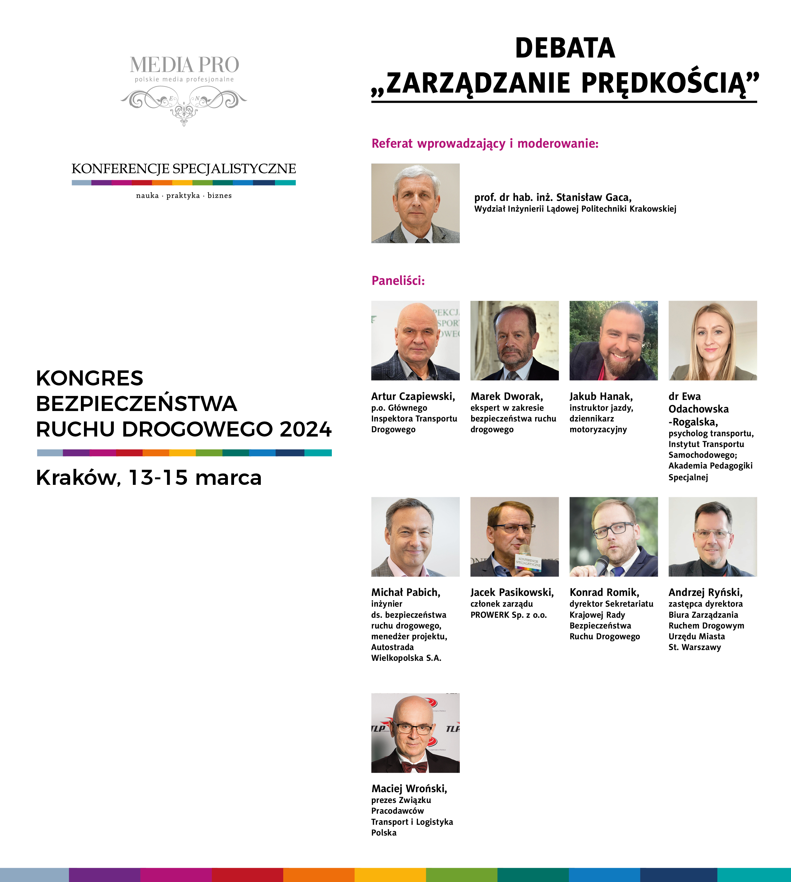 Wnioski z debaty „ZARZĄDZANIE PRĘDKOŚCIĄ” Kongres Bezpieczeństwa Ruchu Drogowego 2024 Kraków, 13-15.03.2024 r. Celem debaty była ocena wdrażania zarządzania prędkością w Polsce oraz rozpoczęcie dyskusji na temat zasadności ewentualnych zmian obowiązujących w Polsce ogólnych ograniczeń prędkości. Mimo iż zarządzanie prędkością jest powszechnie uznawane za jeden z najbardziej skutecznych środków poprawy bezpieczeństwa ruchu drogowego, to jednak praktyka nie zawsze potwierdza właściwe korzystanie z tego środka. Dlatego za celowe uznano poszukiwanie odpowiedzi na następujące pytania: 1. czy zasadnym byłyby zmiany obowiązujących ogólnych ograniczeń prędkości, a jeśli tak, to jakie ograniczenia można uznać za racjonalne i oczekiwane także z uwagi na ich społeczną akceptację? Założeniem debaty było interdyscyplinarne spojrzenie na wymienione powyżej problemy i dlatego zaproszono do udziału w niej osoby reprezentujące różne specjalności zawodowe. W debacie udział wzięli: Artur Czapiewski, p.o. Głównego Inspektora Transportu Drogowego; Marek Dworak, ekspert w zakresie bezpieczeństwa ruchu drogowego; Jakub Hanak, instruktor jazdy, dziennikarz motoryzacyjny; dr Ewa Odachowska-Rogalska, psycholog transportu, Instytut Transportu Samochodowego, Akademia Pedagogiki Specjalnej; Michał Pabich, inżynier ds. bezpieczeństwa ruchu drogowego, menedżer projektu, Autostrada Wielkopolska S.A.; Jacek Pasikowski, wicedyrektor Prowerk Sp. z o.o.; Konrad Romik, dyrektor sekretariatu Krajowej Rady Bezpieczeństwa Ruchu Drogowego; Andrzej Ryński, zastępca dyrektora Biura Zarządzania Ruchem Drogowym Urzędu Miasta St. Warszawy; Maciej Wroński, prezes Związku Pracodawców Transport i Logistyka Polska. Poniżej podano najważniejsze wnioski z debaty w kolejności zgodnej ze sformułowanymi pytaniami. a) w dyskusji nie potwierdzono często powtarzanego argumentu, że zarządzanie prędkością, obejmujące m.in. ustanawianie ogólnych ograniczeń prędkości, generuje konflikty interesów różnych grup uczestników ruchu. Ograniczenia prędkości są w przypadku transportu towarowego oceniane głównie w aspekcie kosztów ruchu i oddziaływań na środowisko, co jest związane m.in. z zapewnieniem płynności ruchu. Dlatego ograniczenia poprawiające płynność ruchu są bardziej zrozumiałe i akceptowane;